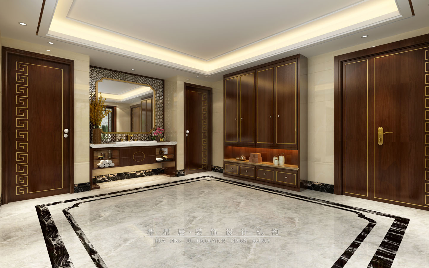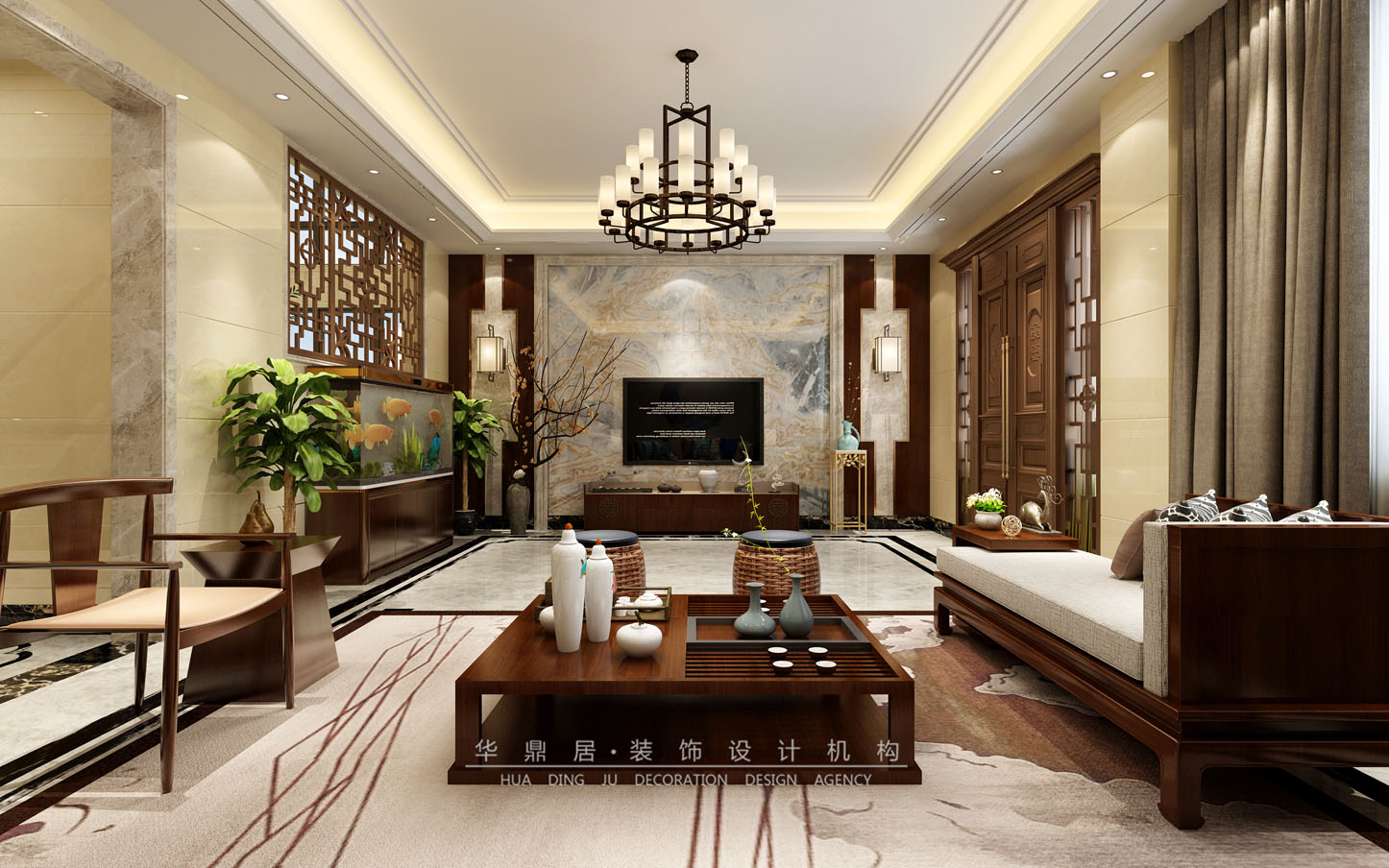 設(shè)計說明:本案設(shè)計講究空間的層次感,在需要隔絕視線的地方,使用中式的屏風或窗欞、中式木門、工藝隔斷、簡約化的中式“博古架”,通過這種新的分隔方式,展現(xiàn)出中式家居的層次之美。再以一些簡約的造型為基礎(chǔ),添加了中式元素,使整體空間感覺更加豐富,大而不空、厚而不重,有格調(diào)又不顯壓抑。