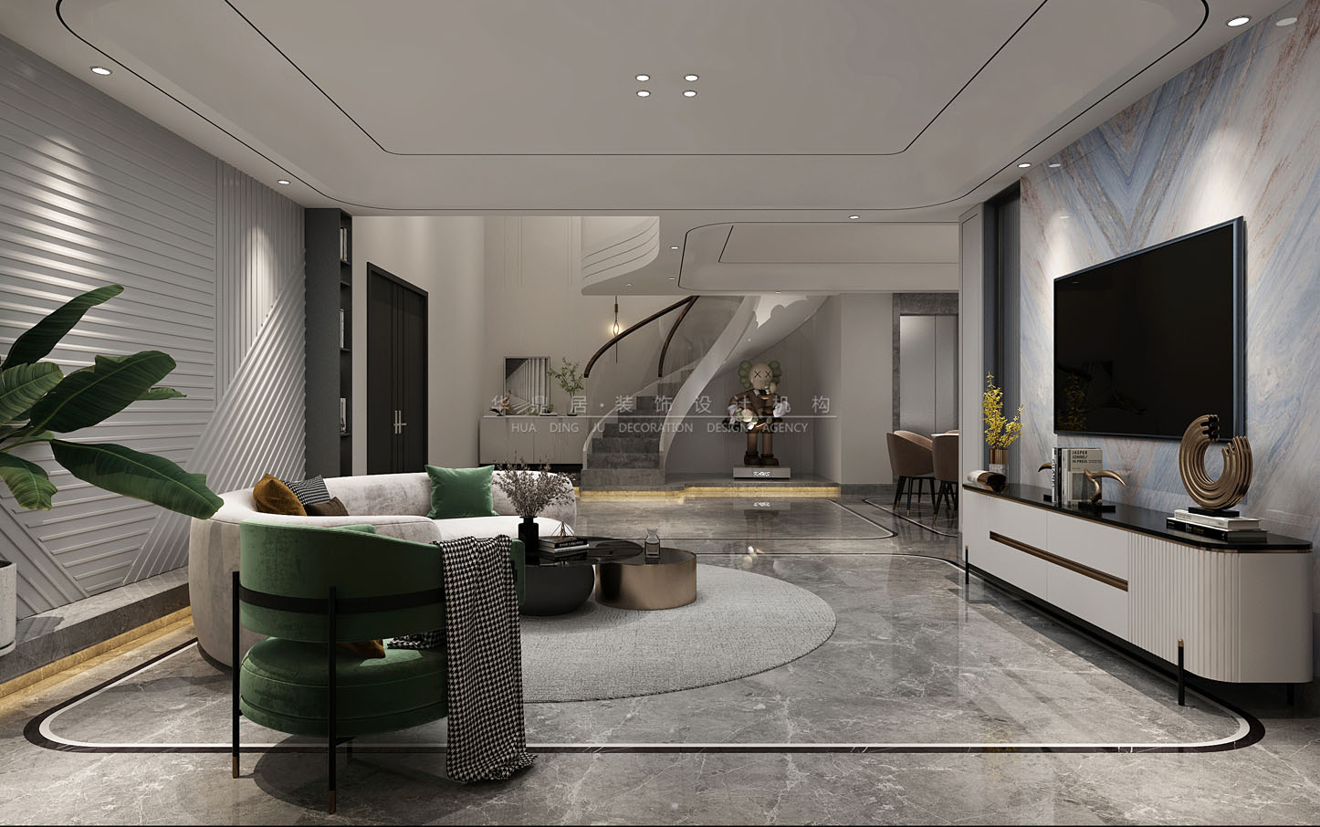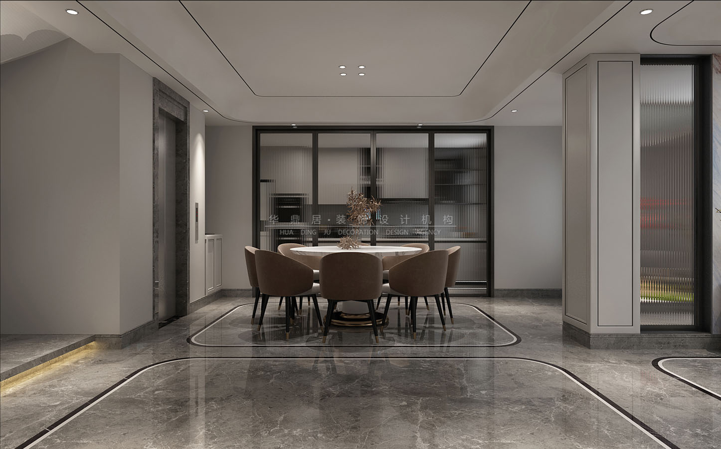 主要建材:星白石材、黑鈦拉絲金屬線條、進(jìn)口藝術(shù)漆、灰橡木地板、皮紋墻板等