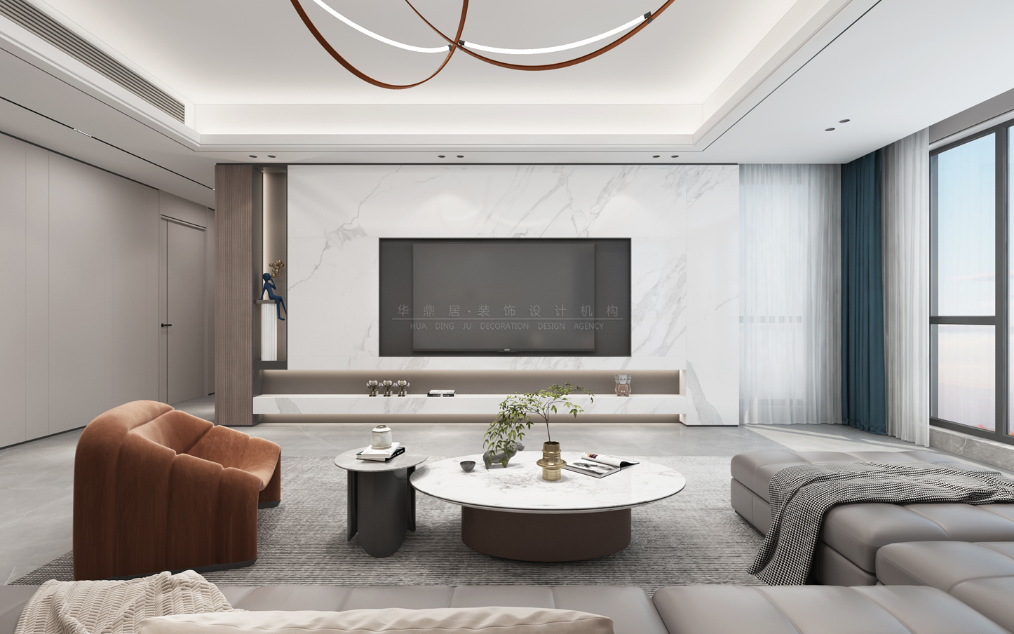 主要建材:灰紋大板磚、奶油灰護墻板、爵士白石材電視背景等