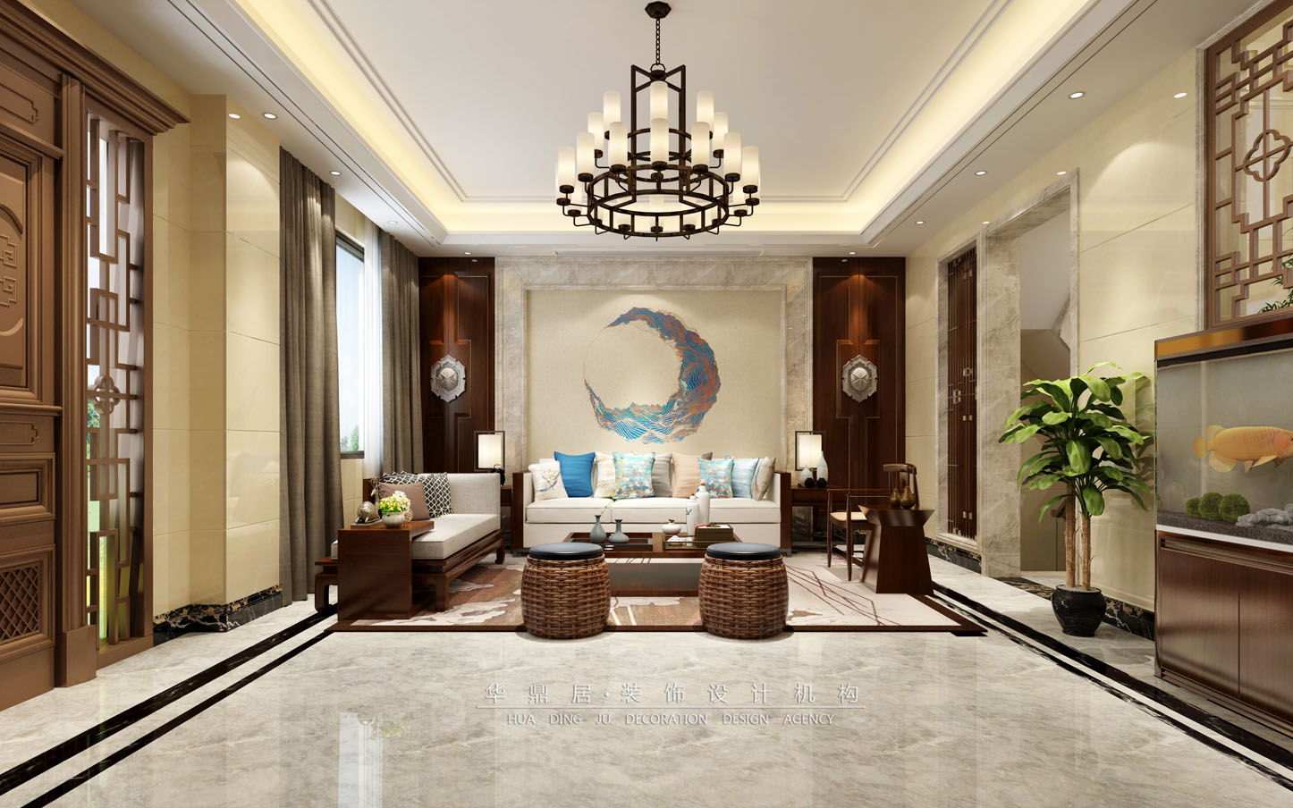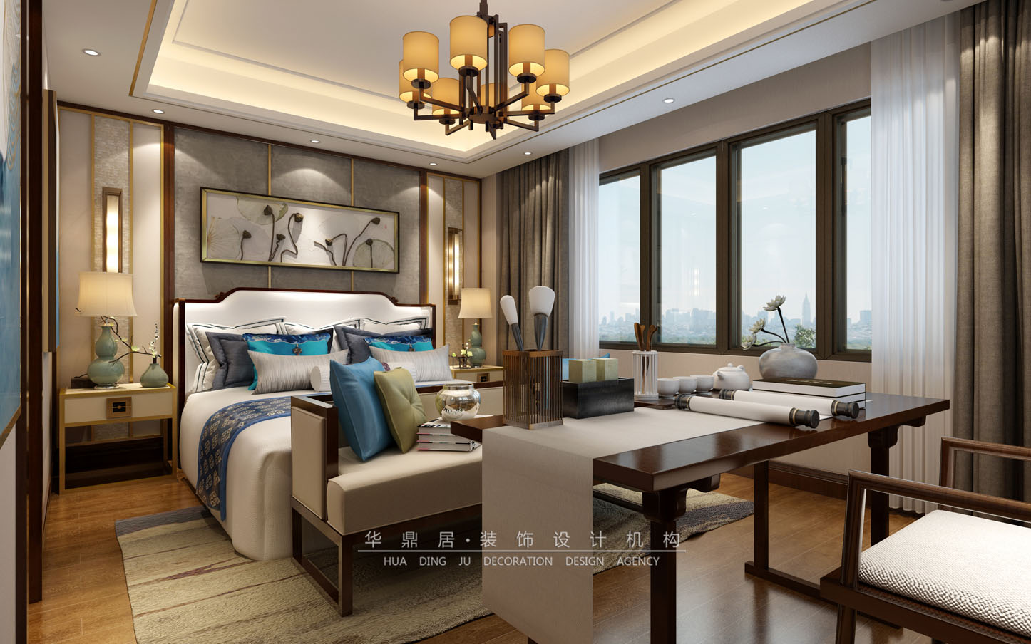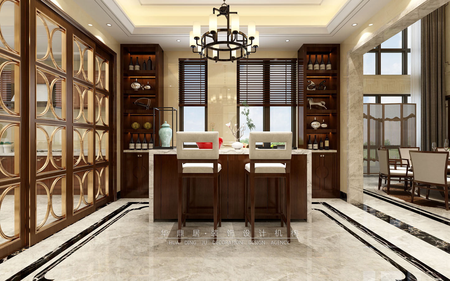 設(shè)計說明:本案設(shè)計講究空間的層次感,在需要隔絕視線的地方,使用中式的屏風或窗欞、中式木門、工藝隔斷、簡約化的中式“博古架”,通過這種新的分隔方式,展現(xiàn)出中式家居的層次之美。再以一些簡約的造型為基礎(chǔ),添加了中式元素,使整體空間感覺更加豐富,大而不空、厚而不重,有格調(diào)又不顯壓抑。