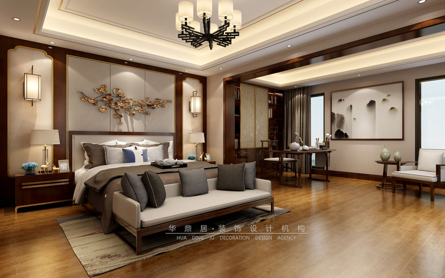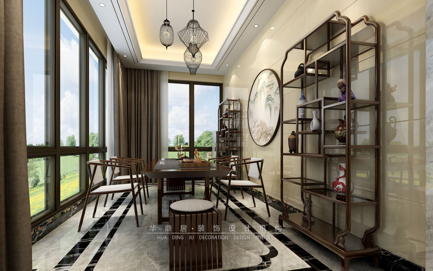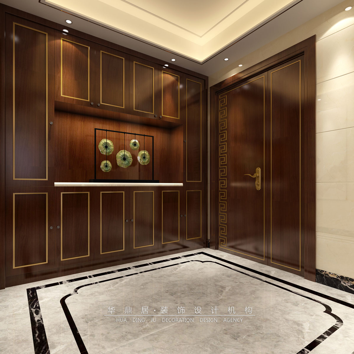 設(shè)計說明:本案設(shè)計講究空間的層次感,在需要隔絕視線的地方,使用中式的屏風或窗欞、中式木門、工藝隔斷、簡約化的中式“博古架”,通過這種新的分隔方式,展現(xiàn)出中式家居的層次之美。再以一些簡約的造型為基礎(chǔ),添加了中式元素,使整體空間感覺更加豐富,大而不空、厚而不重,有格調(diào)又不顯壓抑。
