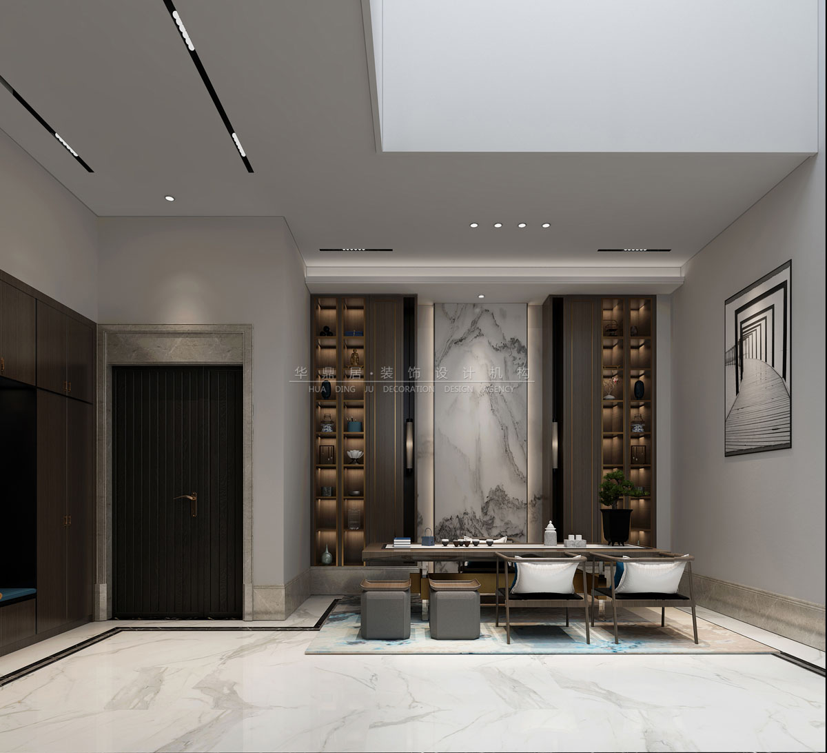 主要建材:星白石材、黑鈦拉絲金屬線條、進(jìn)口藝術(shù)漆