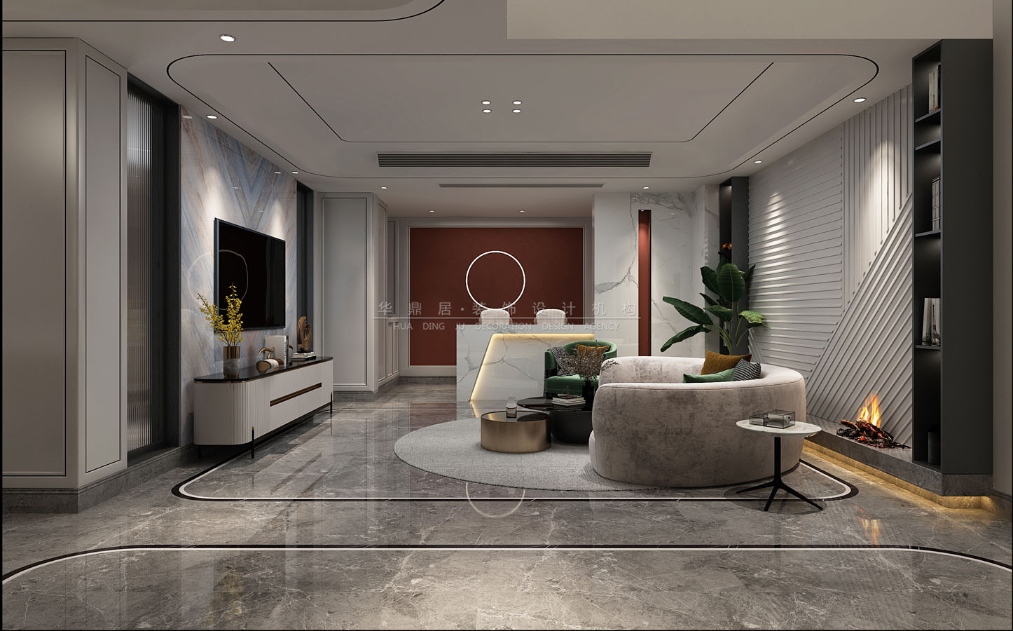 主要建材:星白石材、黑鈦拉絲金屬線條、進(jìn)口藝術(shù)漆、灰橡木地板、皮紋墻板等